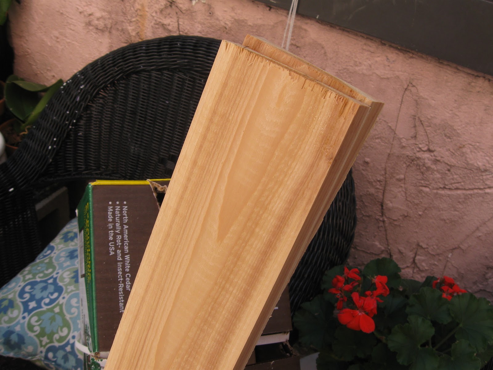 Since we'd already built 3, we realized all we needed with spare parts was two more boards and we'd have a 5th bed. Hello, $6.28 worth of cedar 1x4's trimmed to 47" lengths.