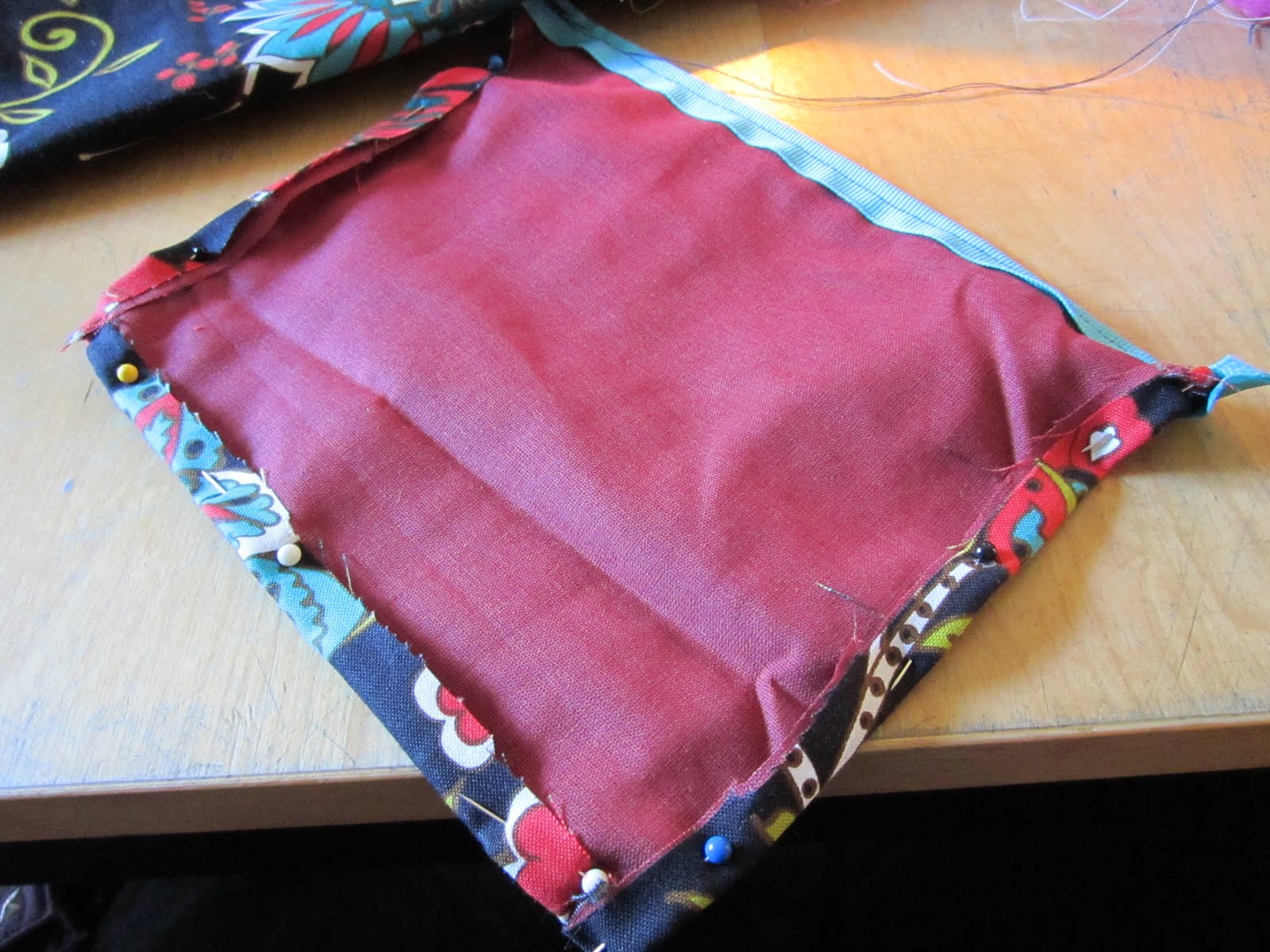 Ok. this part should seem familiar to yesterday's post. Put the lining of the pocket into the pocket side of your bag. Wrong sides touching; patterned side right side out, lining part wrong side out.