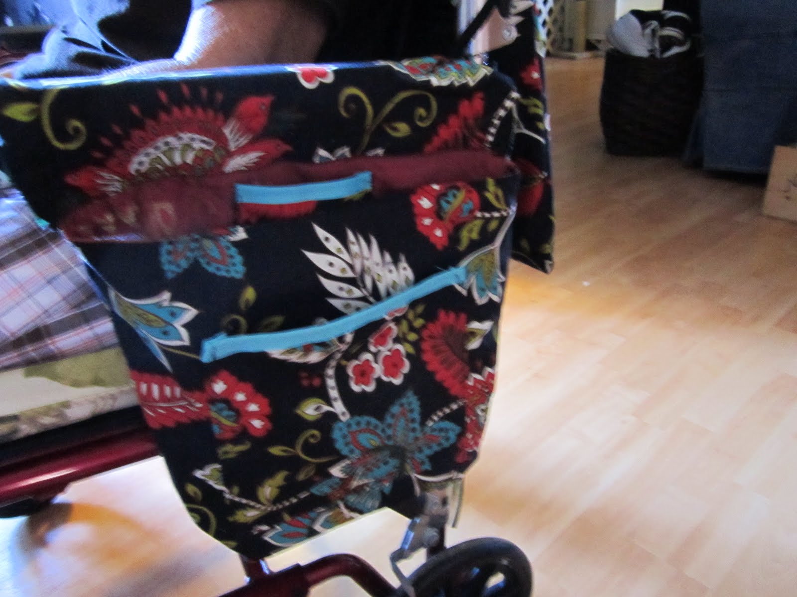 We made two pockets (as is shown below). One large one on the outside for books and stuff, and one smaller one on the inside for a phone (haha, we're forcing Granny to carry a phone! Ha! Mommy even taught her to text!)