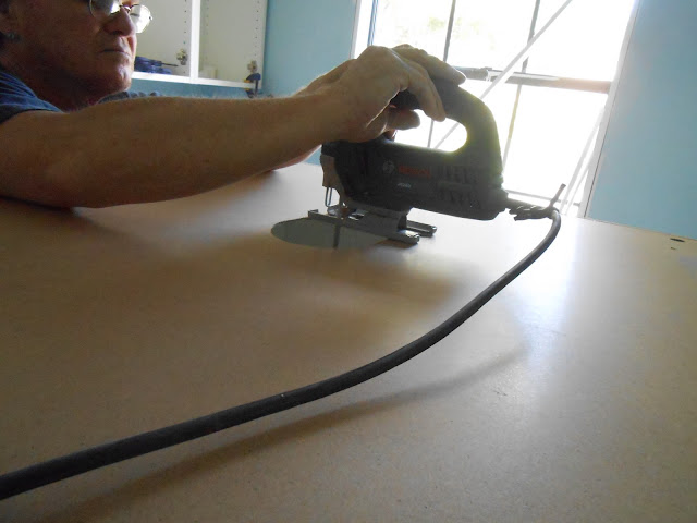 For our sink cabinet, Mark measured the plumbing, marked the cabinet,